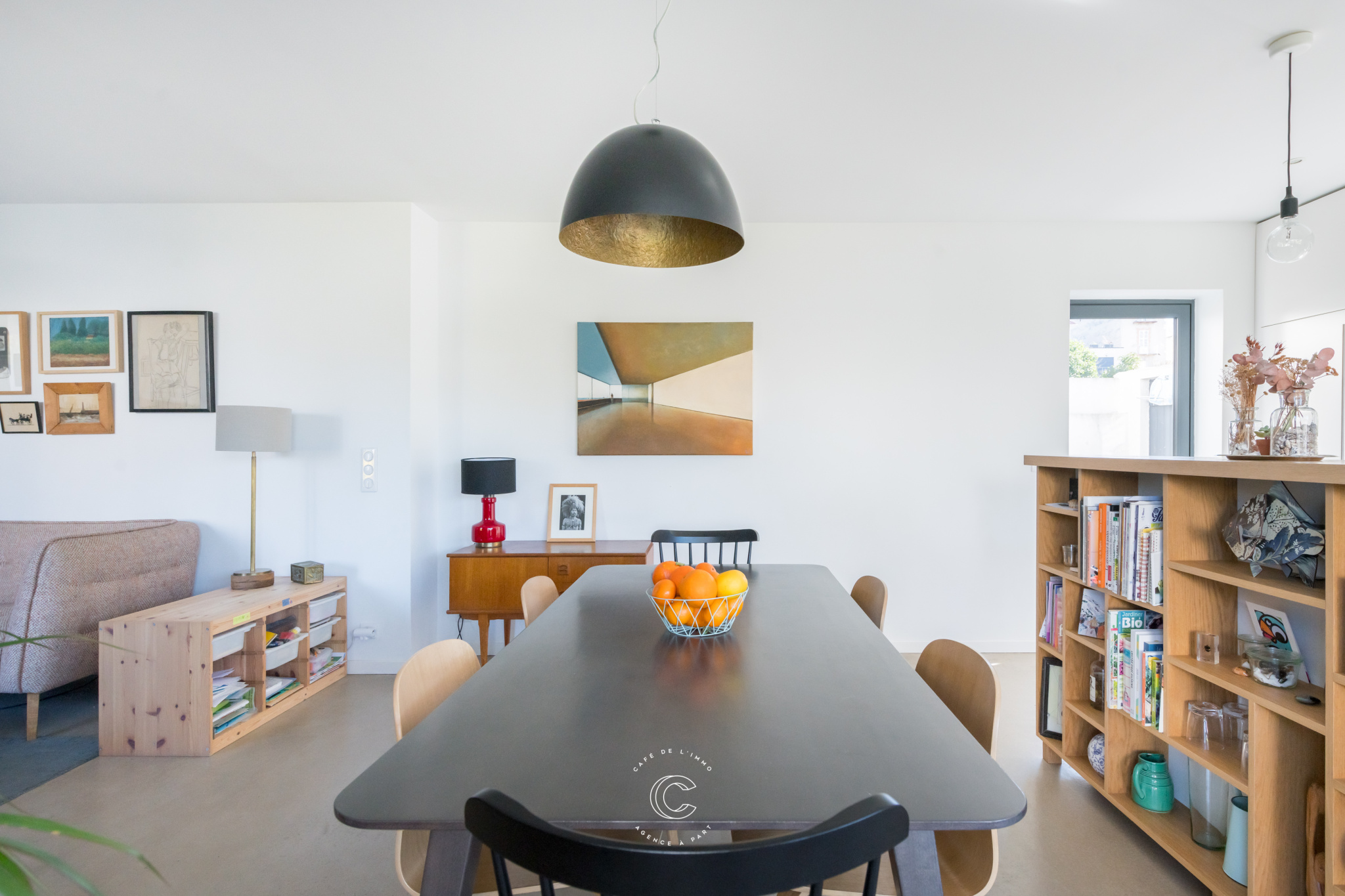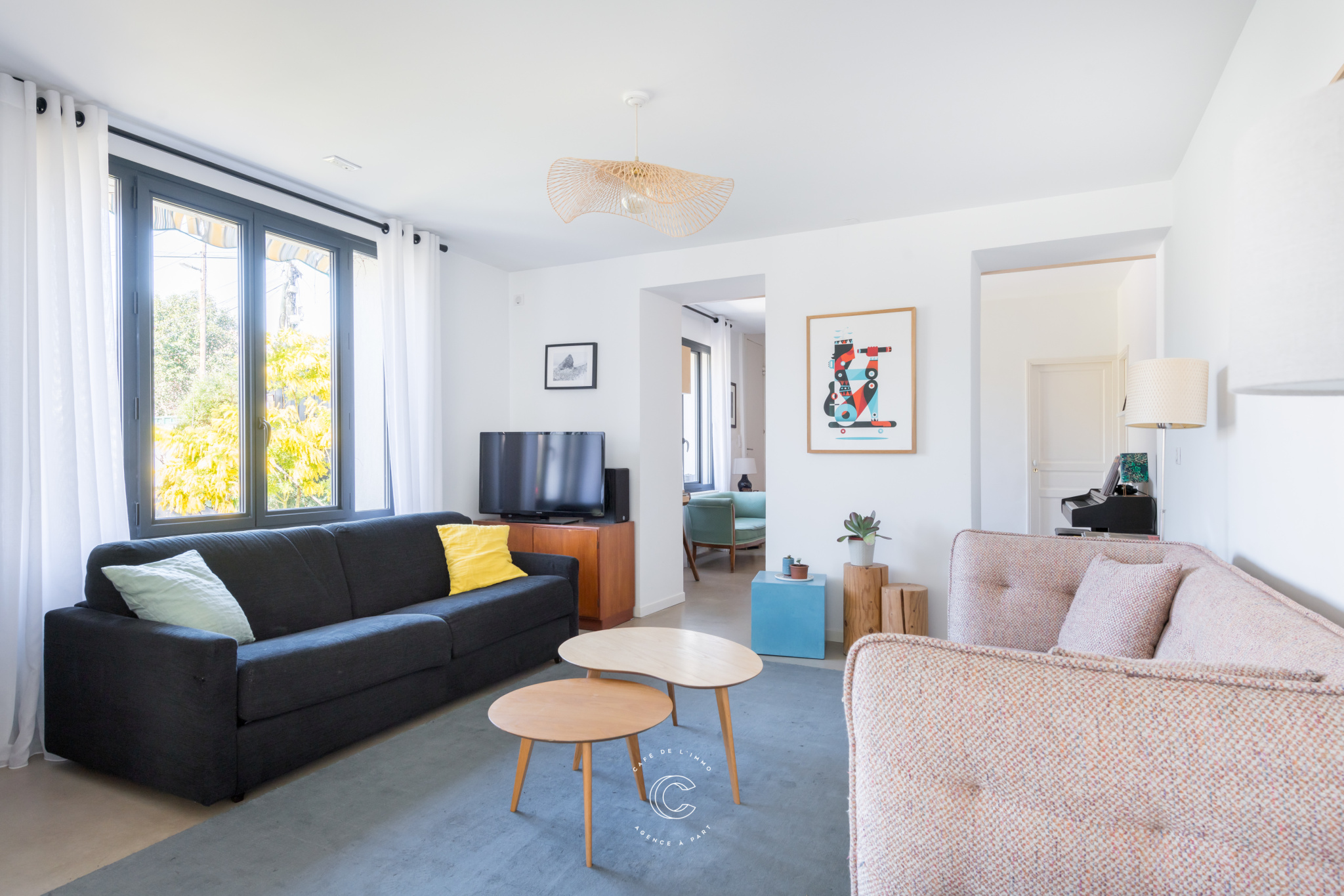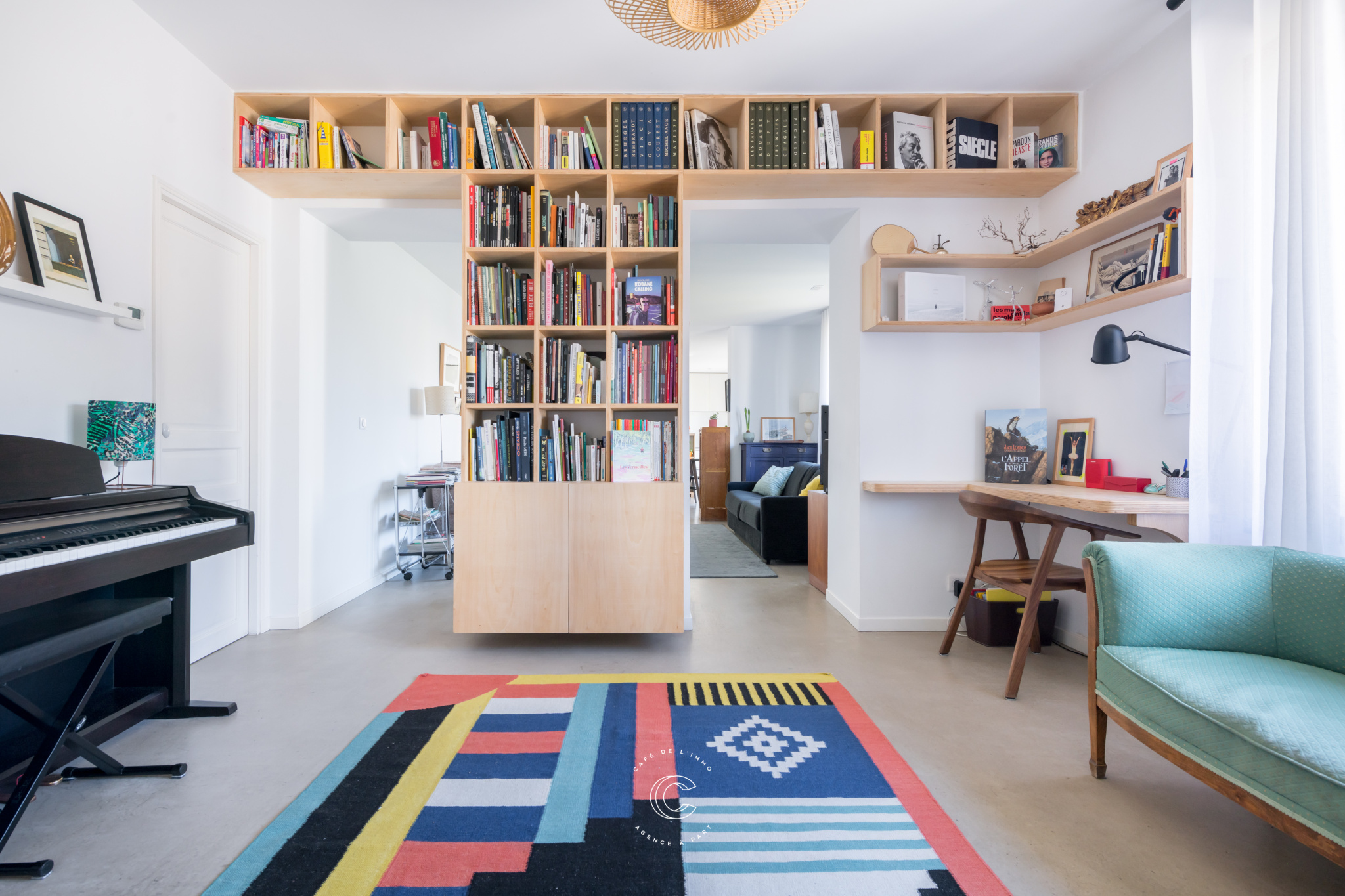 Une belle et grande entrée/bibliothèque s'ouvre sur une pièce à vivre de plus de 42m2, baignée de lumière