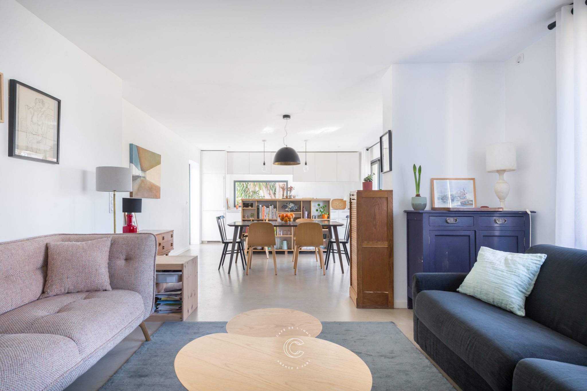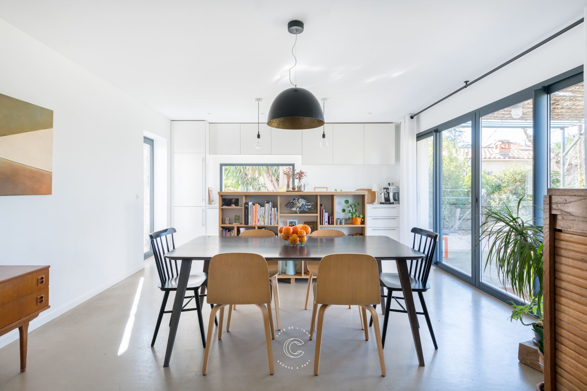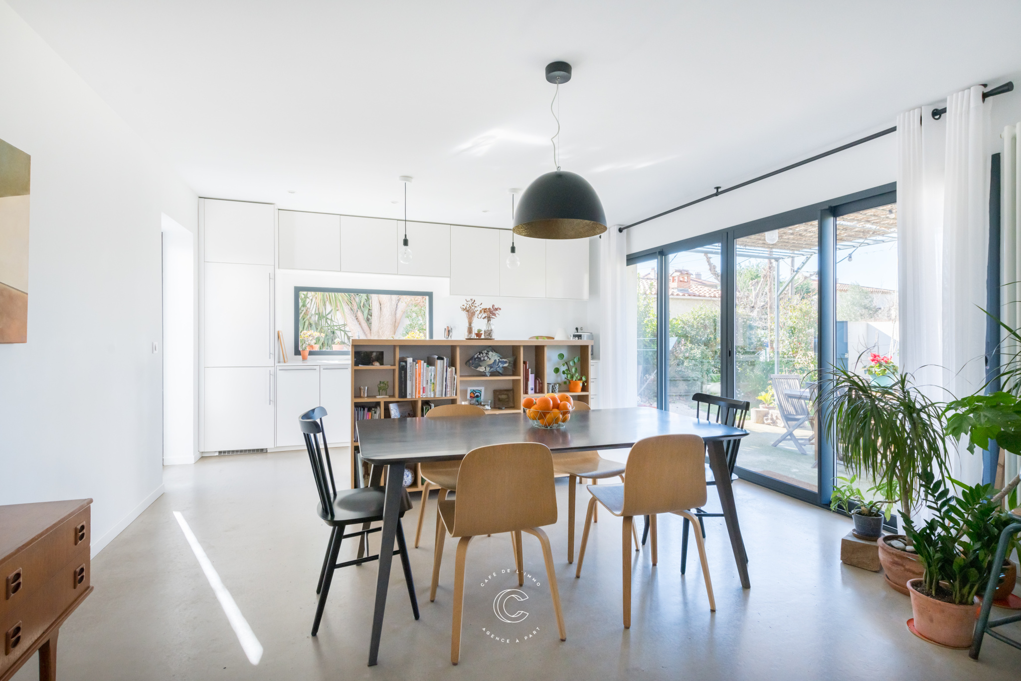 Une belle et grande entrée/bibliothèque s'ouvre sur une pièce à vivre de plus de 42m2, baignée de lumière