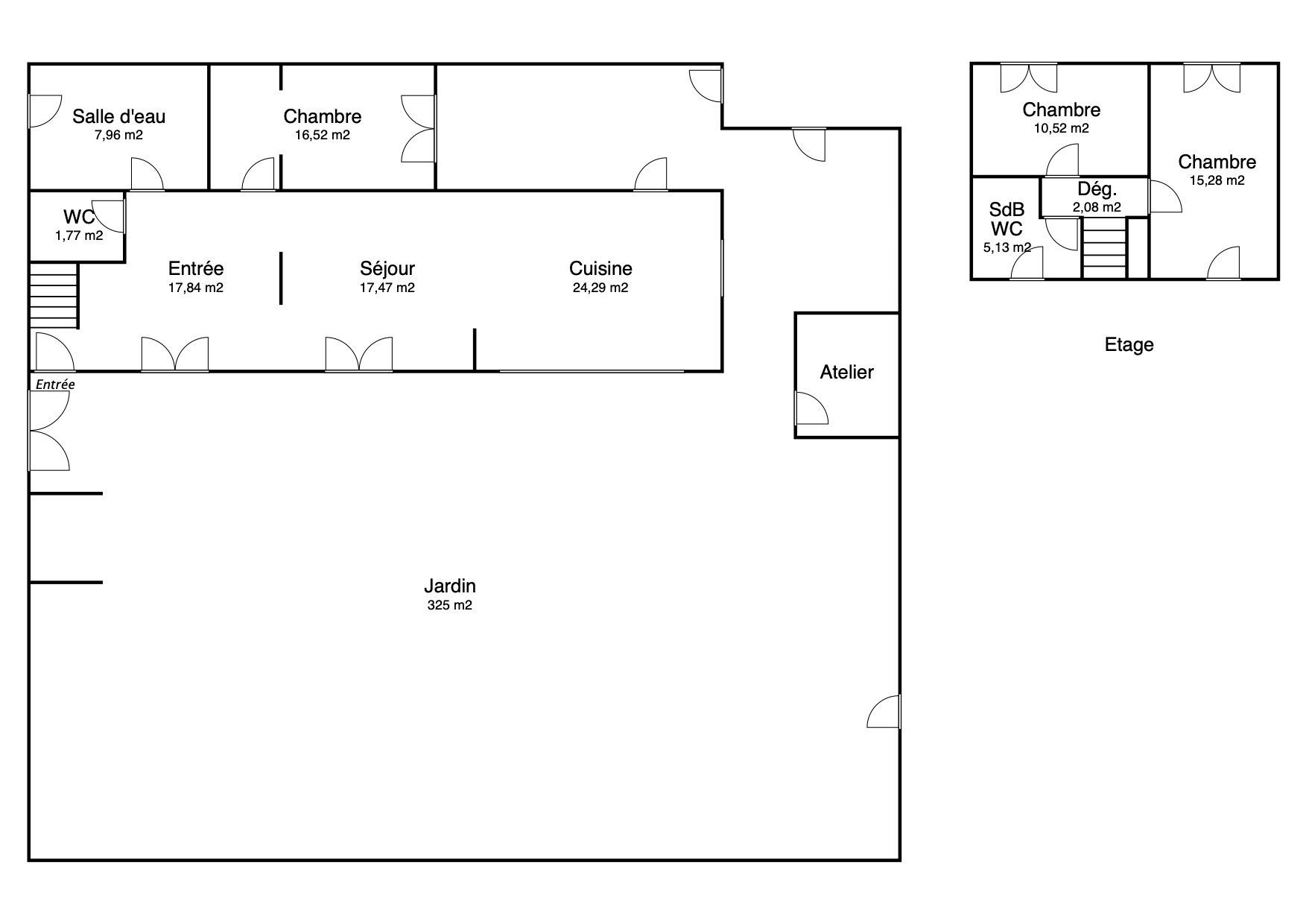 de 10 et 15m2 et d'une salle de bains avec WC.