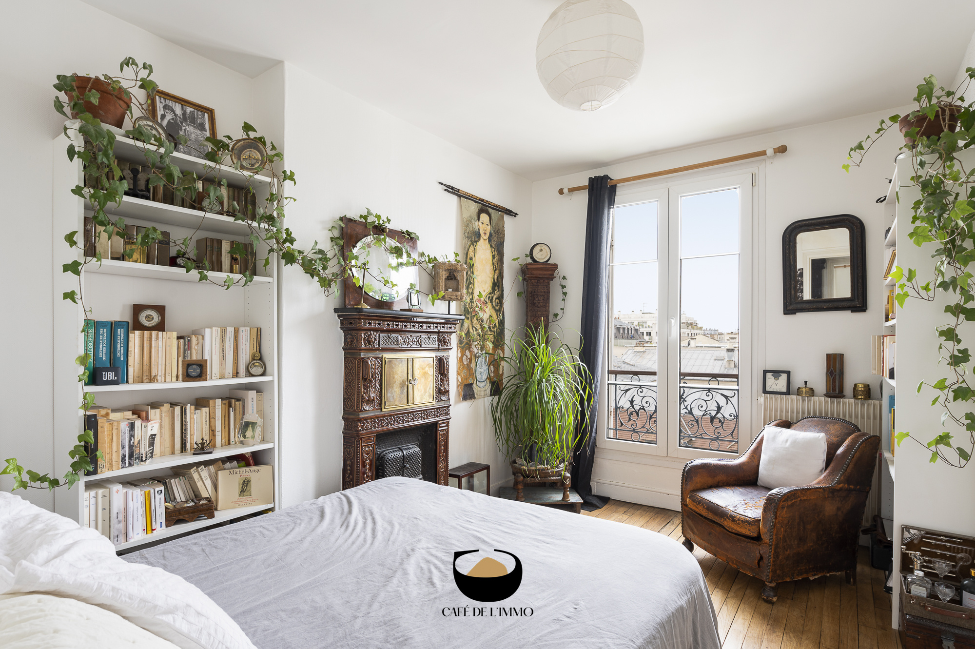 La grande chambre offre une vue imprenable sur les toits de la ville et l'appartement offre également un dressing de près de 2m2.