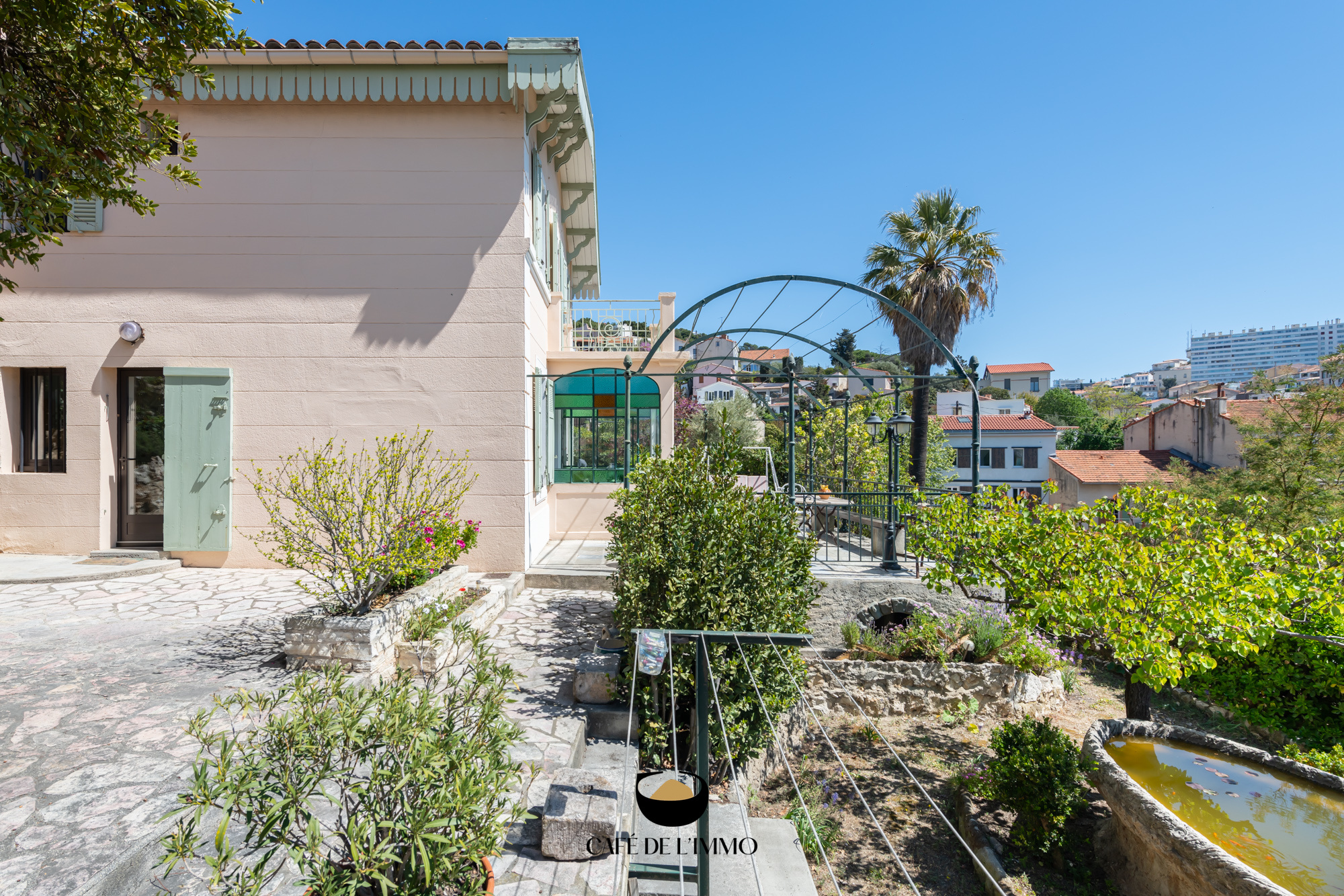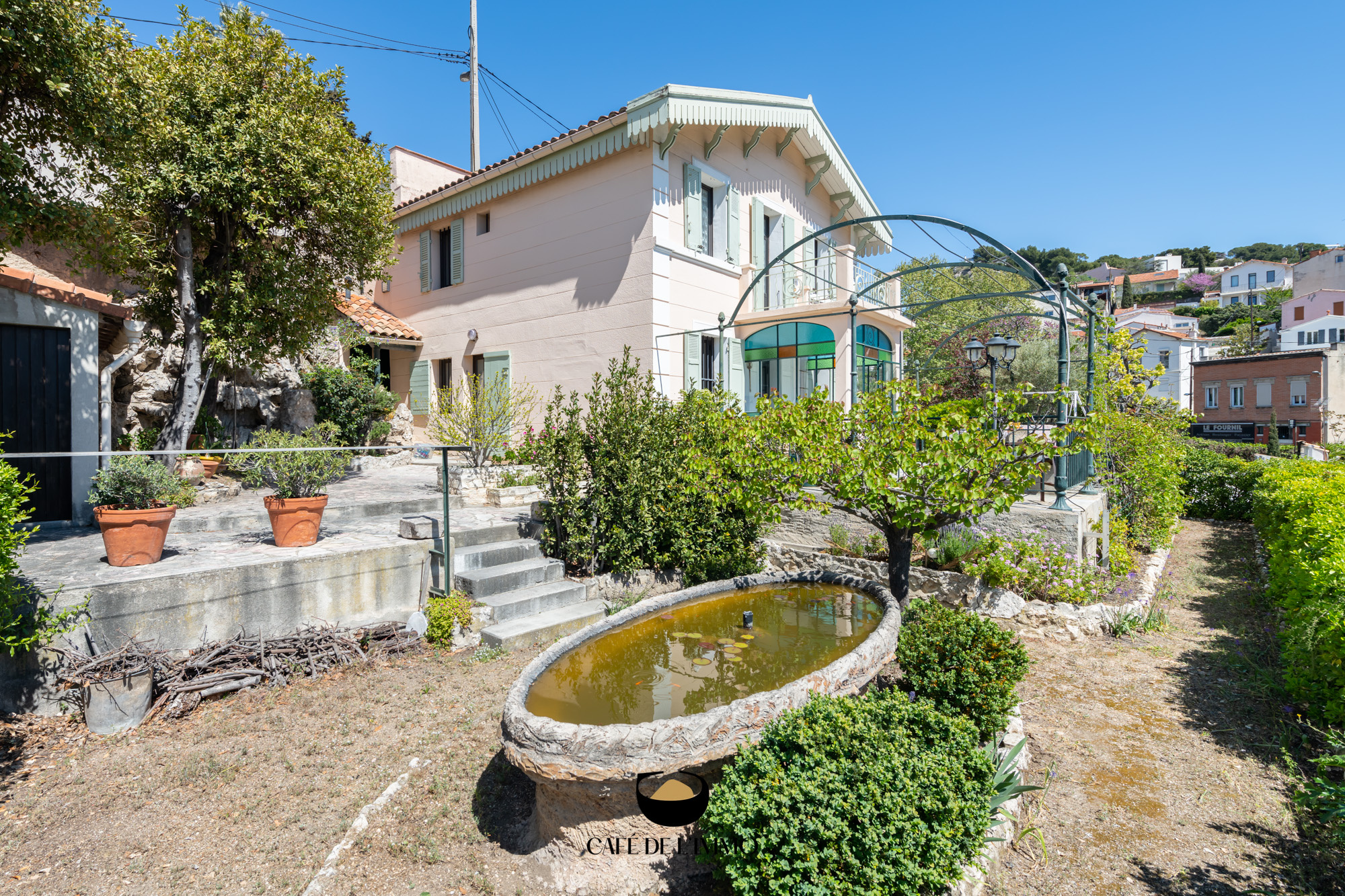 Vous propfiterez des extérieurs toute l'année : terrasse de plain pied côté rez-de-chaussée, jardin avec bassin japonais pouvant aisément se transformer en piscine, coins plus ombragés côté cuisine...