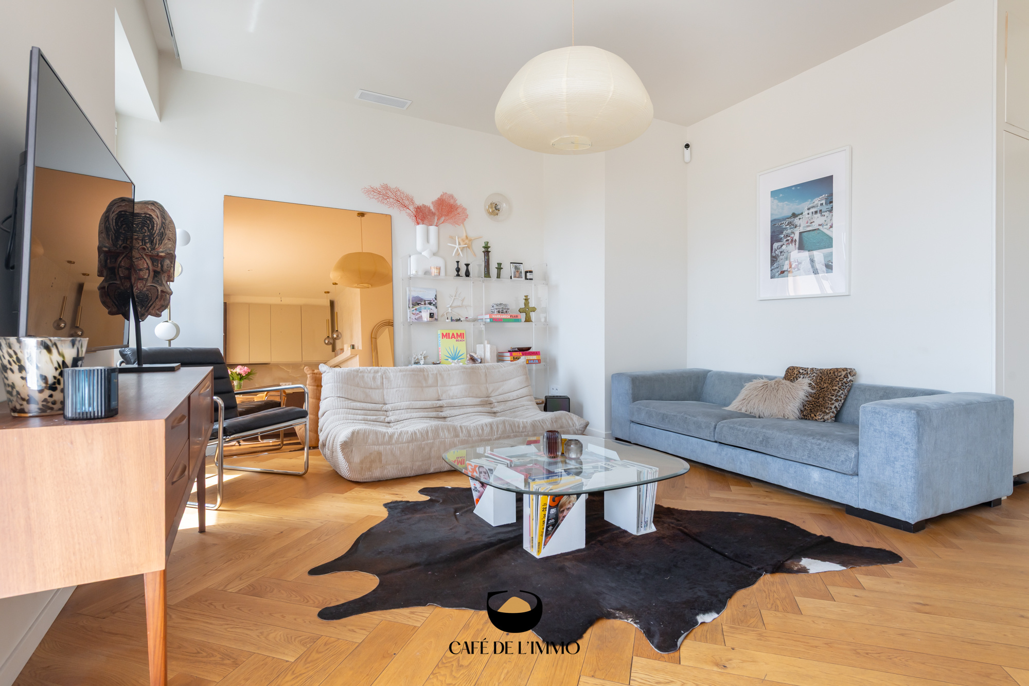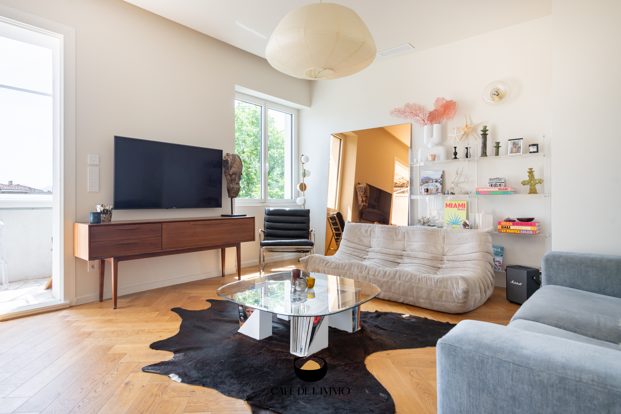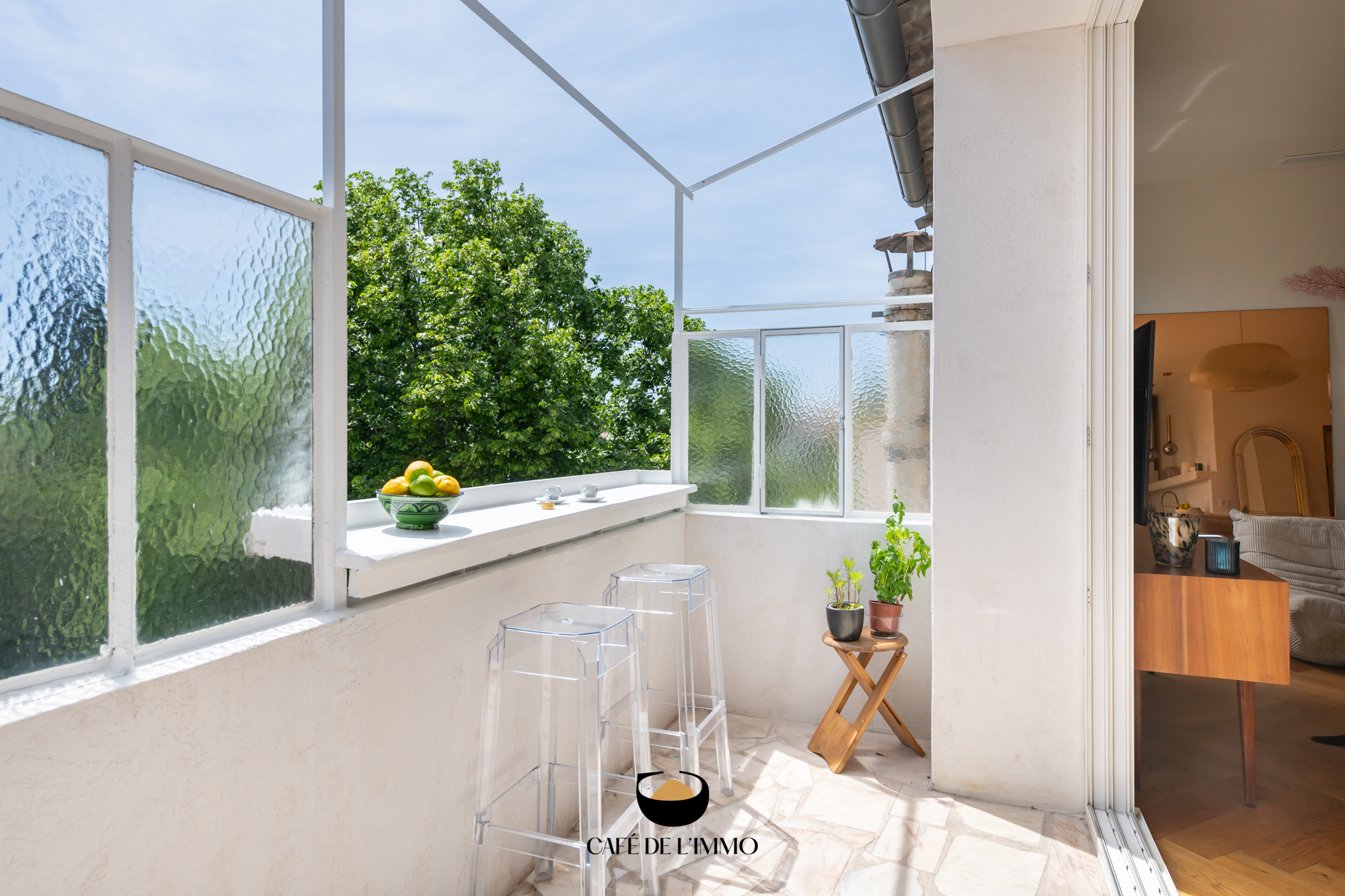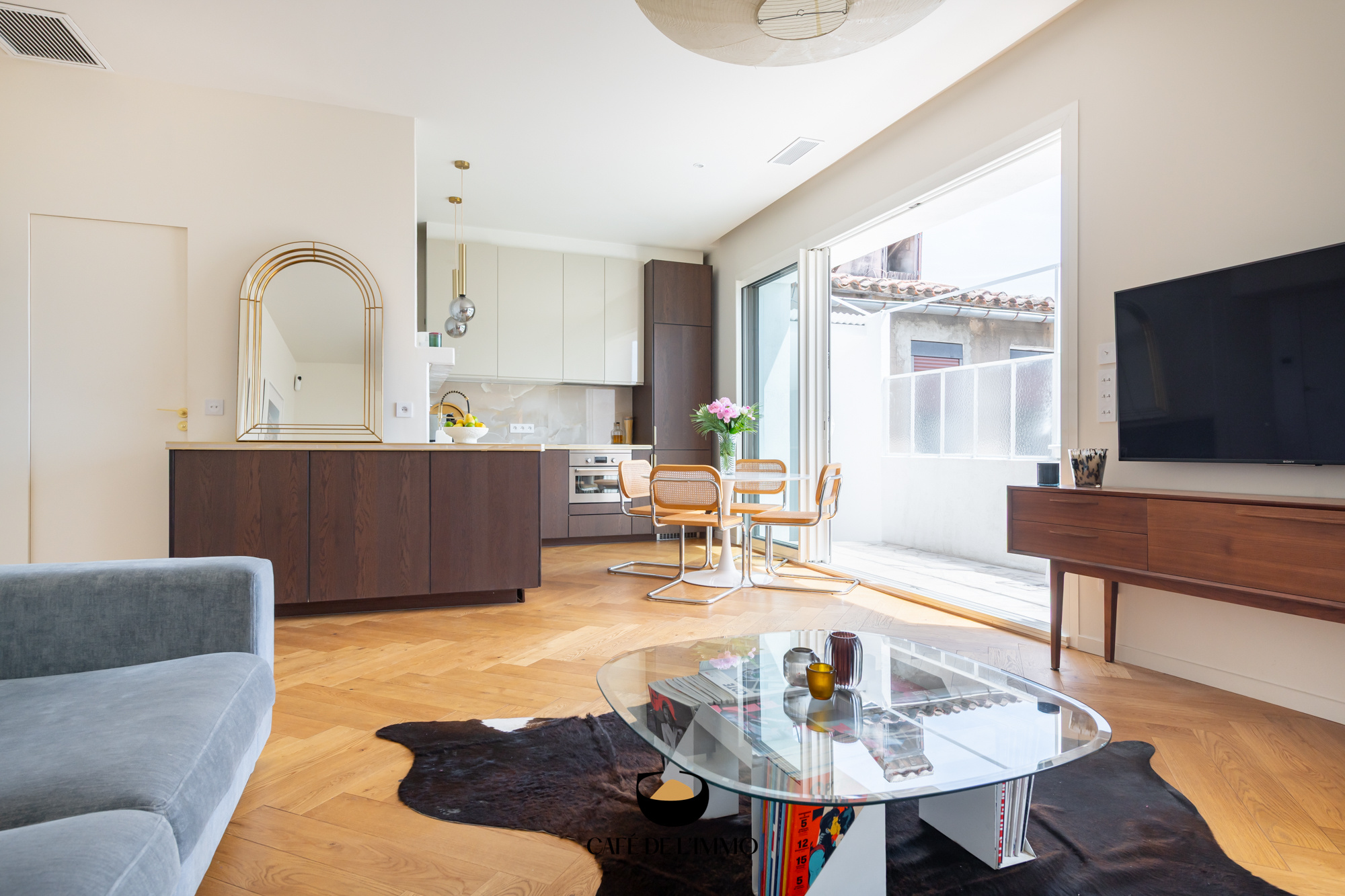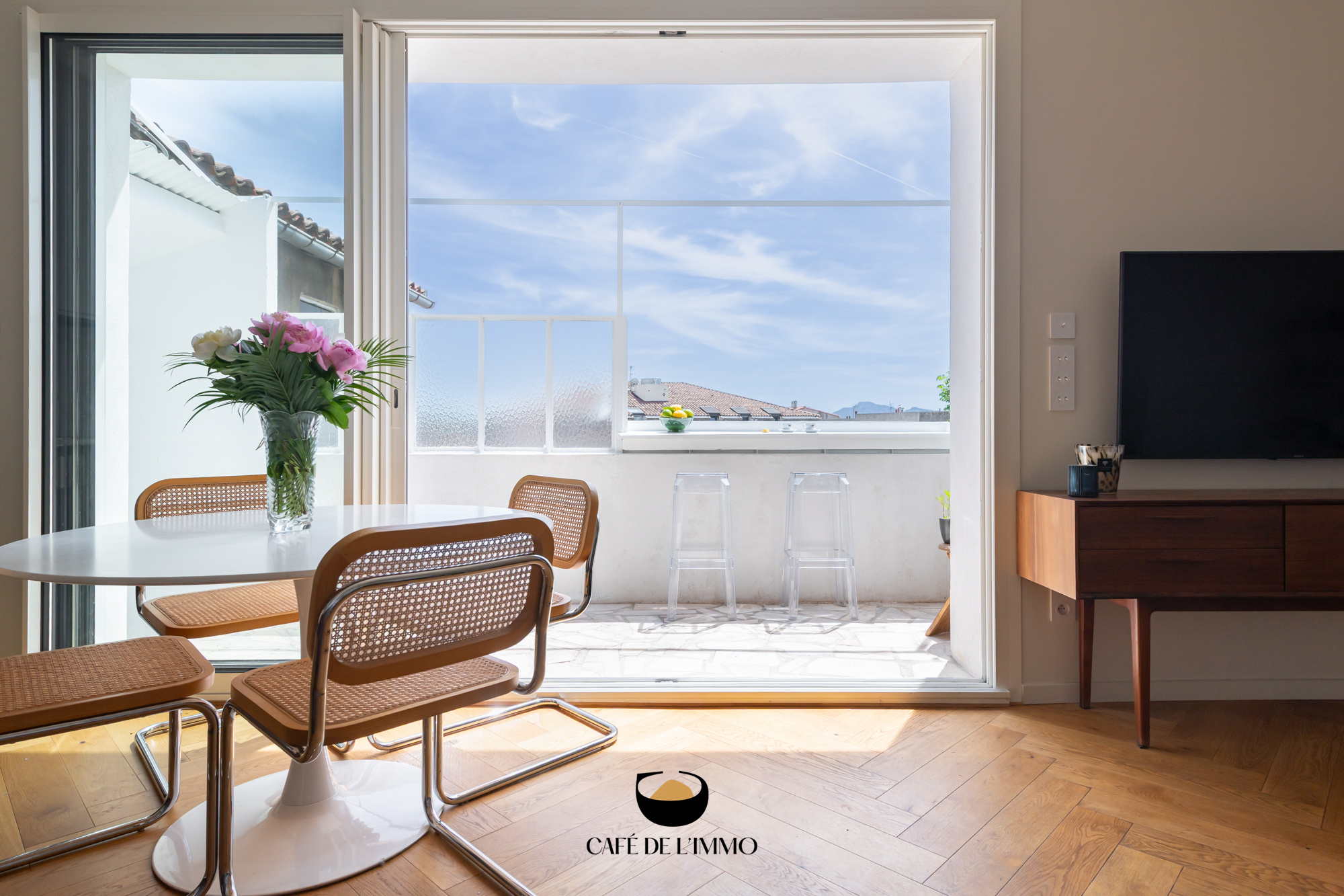 La pièce à vivre, baignée de soleil toute l'année grâce à son exposition plein sud, s’ouvre sur un balcon intimiste, véritable prolongement du séjour, avec vue dégagée sur les jardins, sans vis-à-vis et au calme absolu. La cuisine ouverte et entièrement équipée se fond harmonieusement dans cet espace convivial, pensée pour les moments de partage en famille ou entre amis.