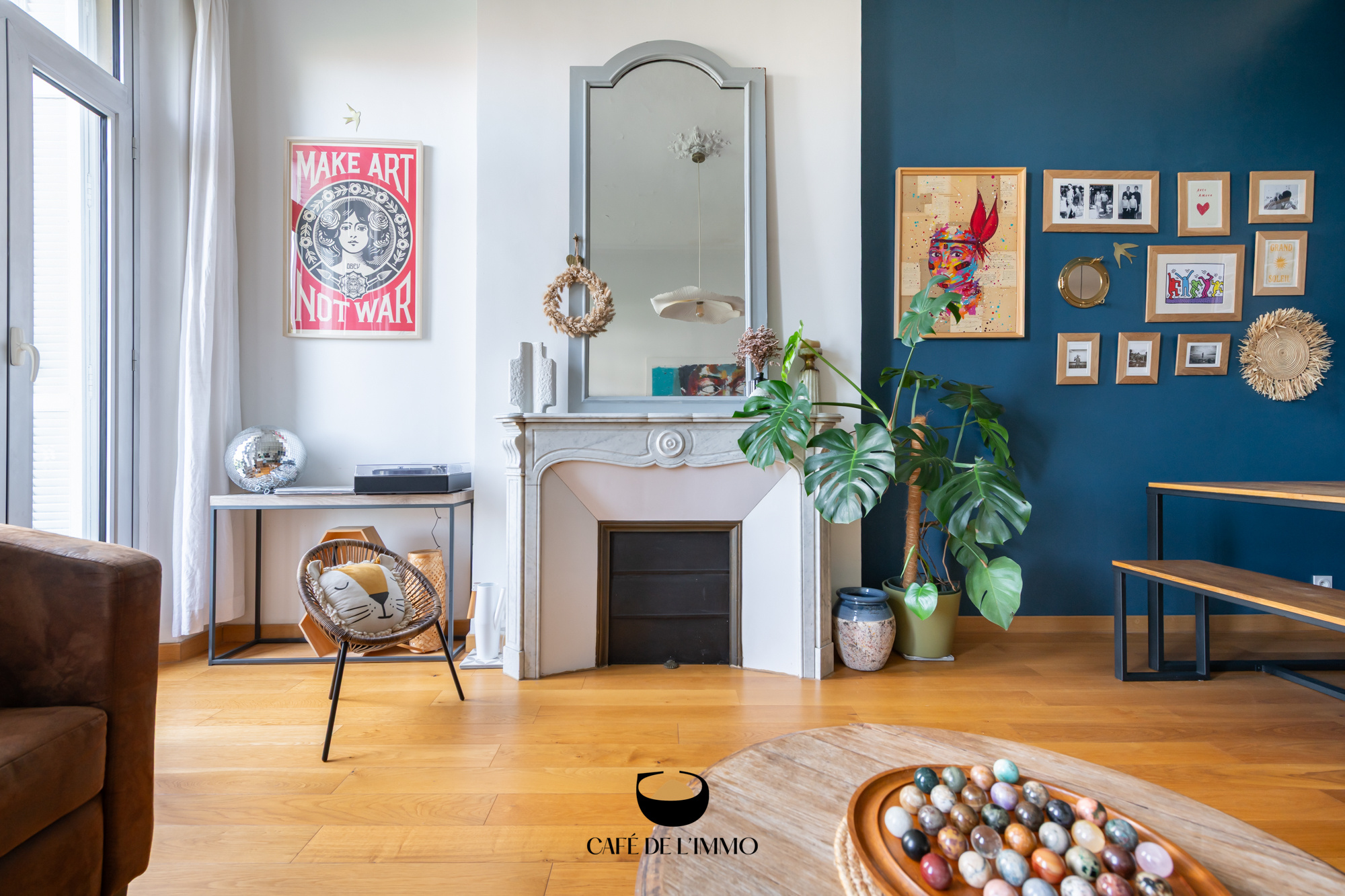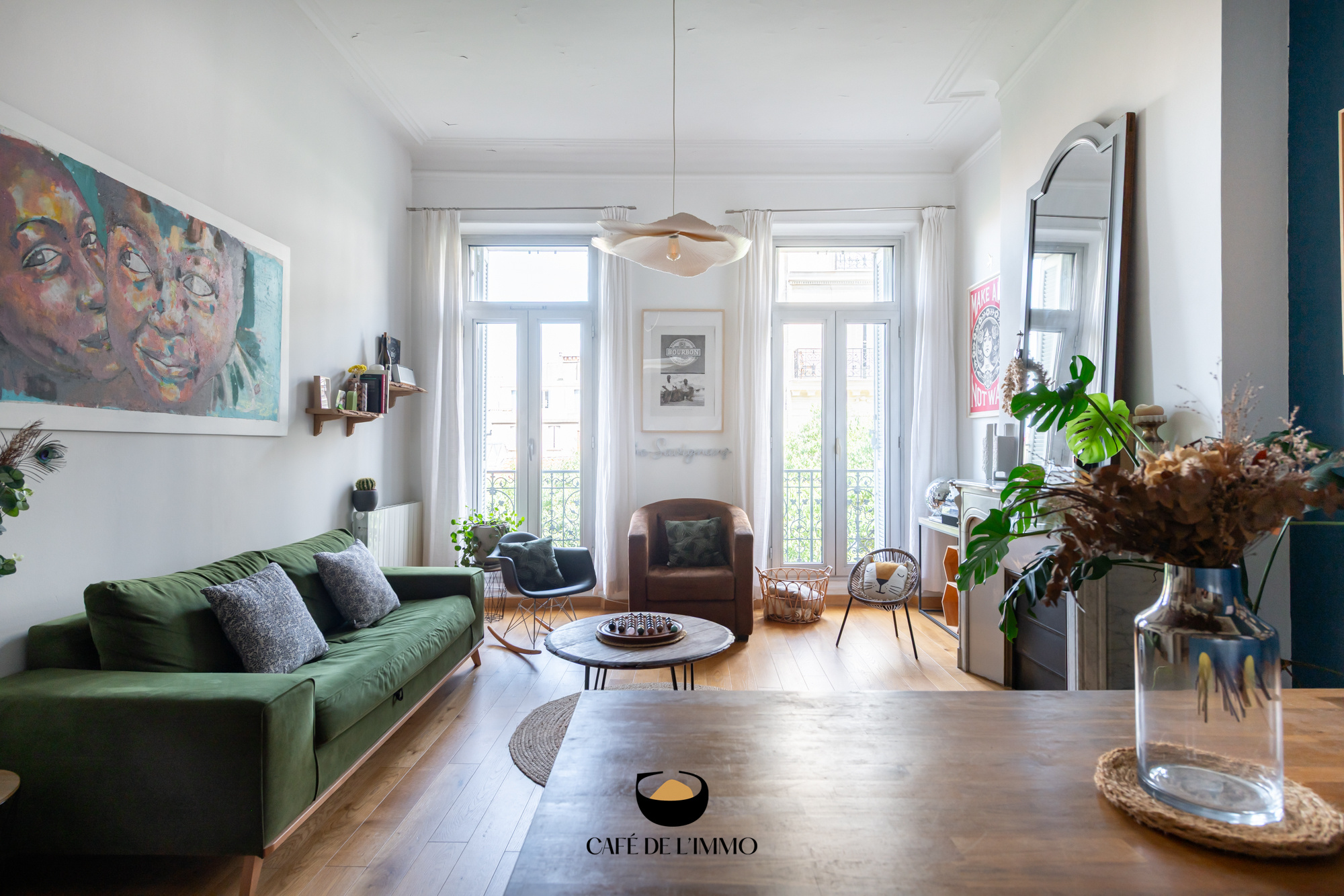- Côté jour, un grand salon/cuisine de plus de 40 m2 dont les grandes portes-fenêtres vous feront profiter d'une belle luminosité. Cheminée, parquet, hauteur sous plafond et moulures : le cachet de l'ancien est bel et bien présent, donnant beaucoup de caractère au lieu. Un premier balcon vous offrira ici le plaisir d'une vue dégagée au quotidien.