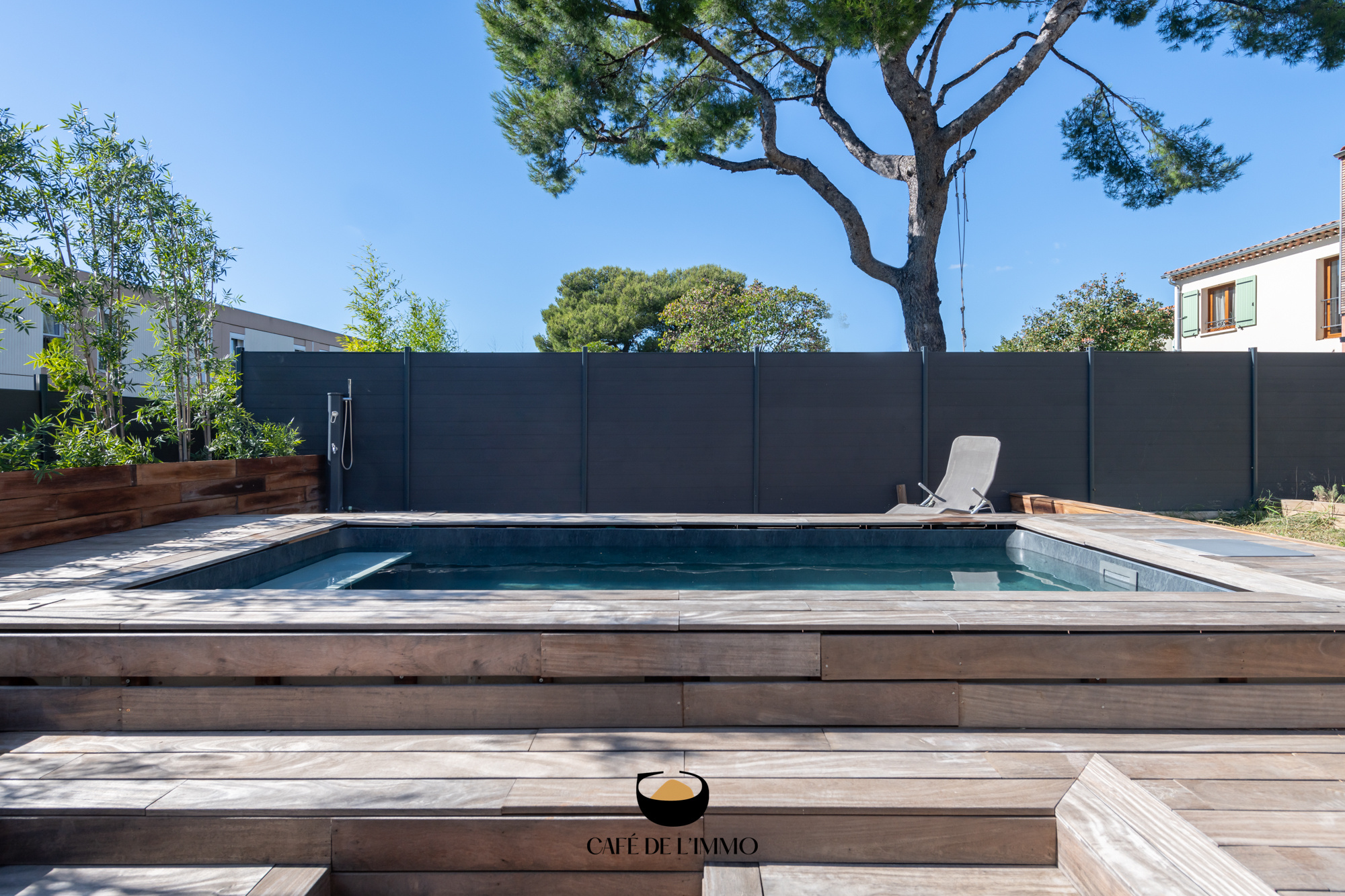 À quelques marches, le jardin de 115 m2, avec la piscine (5x2), qui dispose d’un coin bain de soleil et d’un espace canapé au allure de brasero.