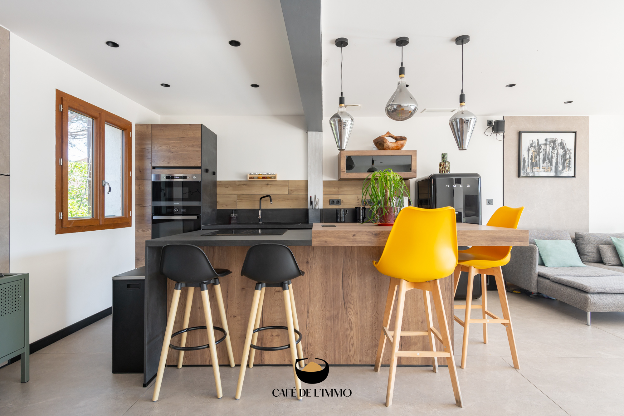 La cuisine, dotée d'un îlot central, idéal pour recevoir, s'ouvre sur un salon-séjour où la cheminée apporte une touche chaleureuse pour les soirées d'hiver.