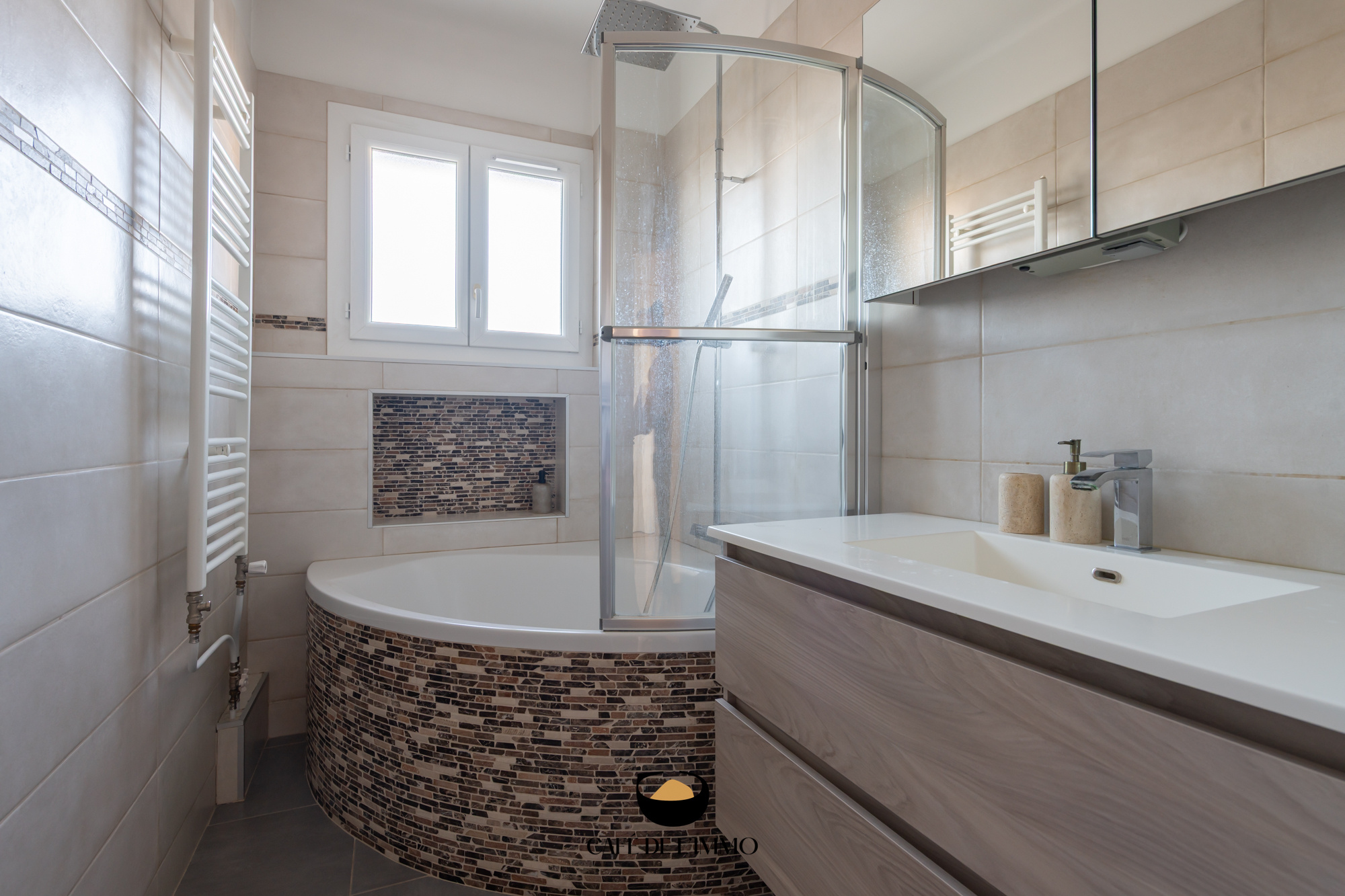L'espace nuit quant à lui propose 2 chambres de 9 et 12m2 avec rangements, une salle de bain et un wc séparé.