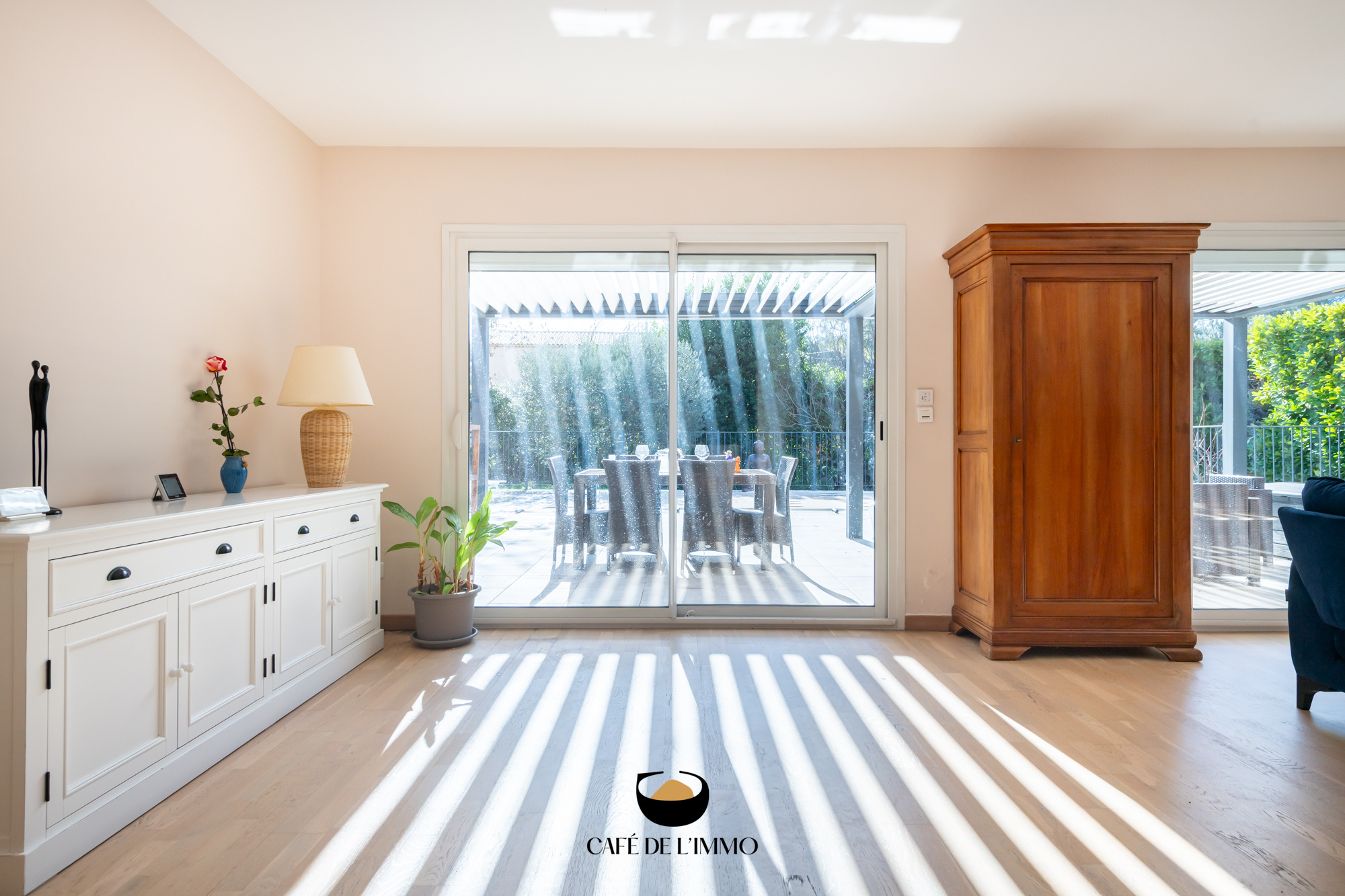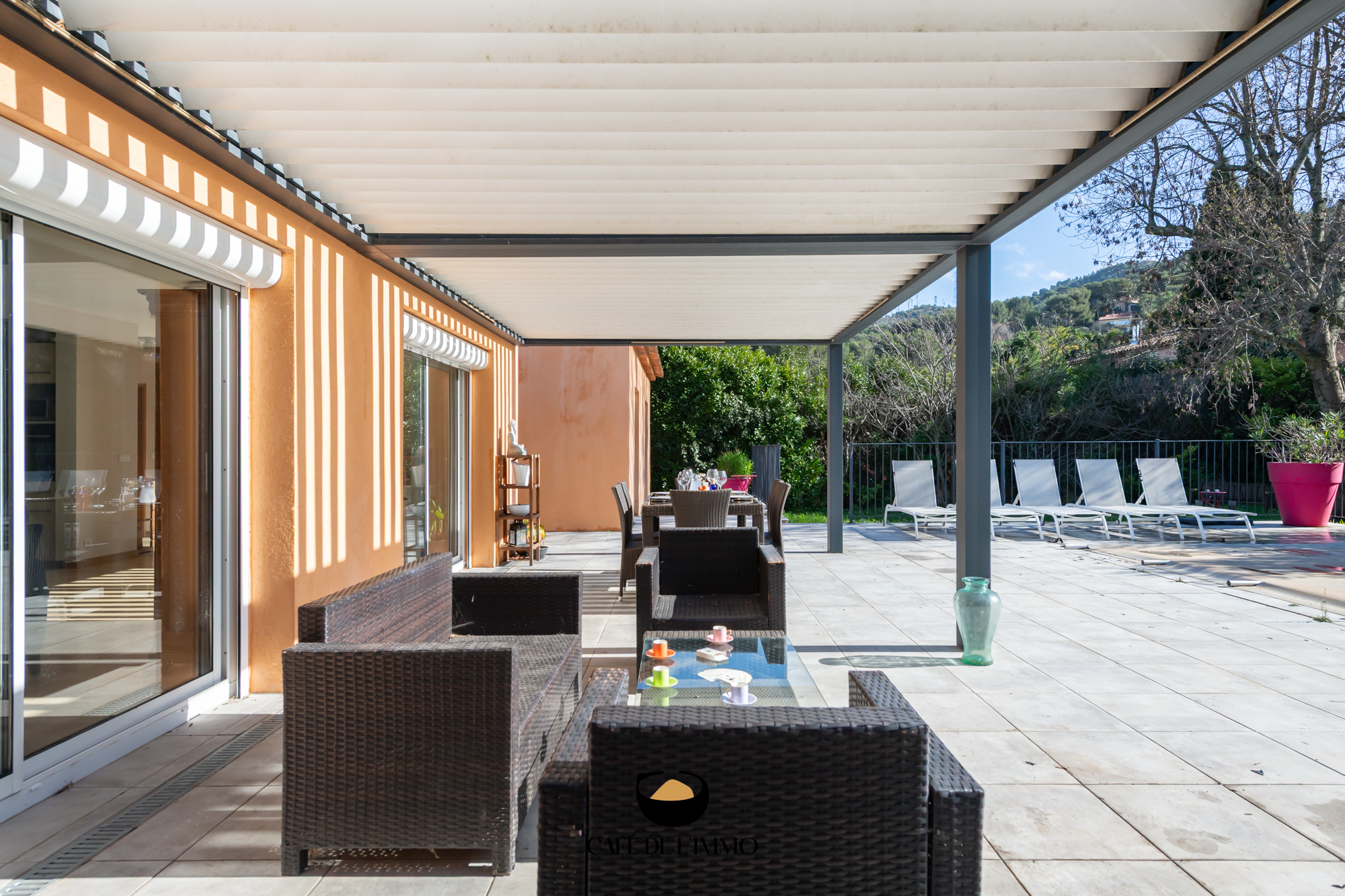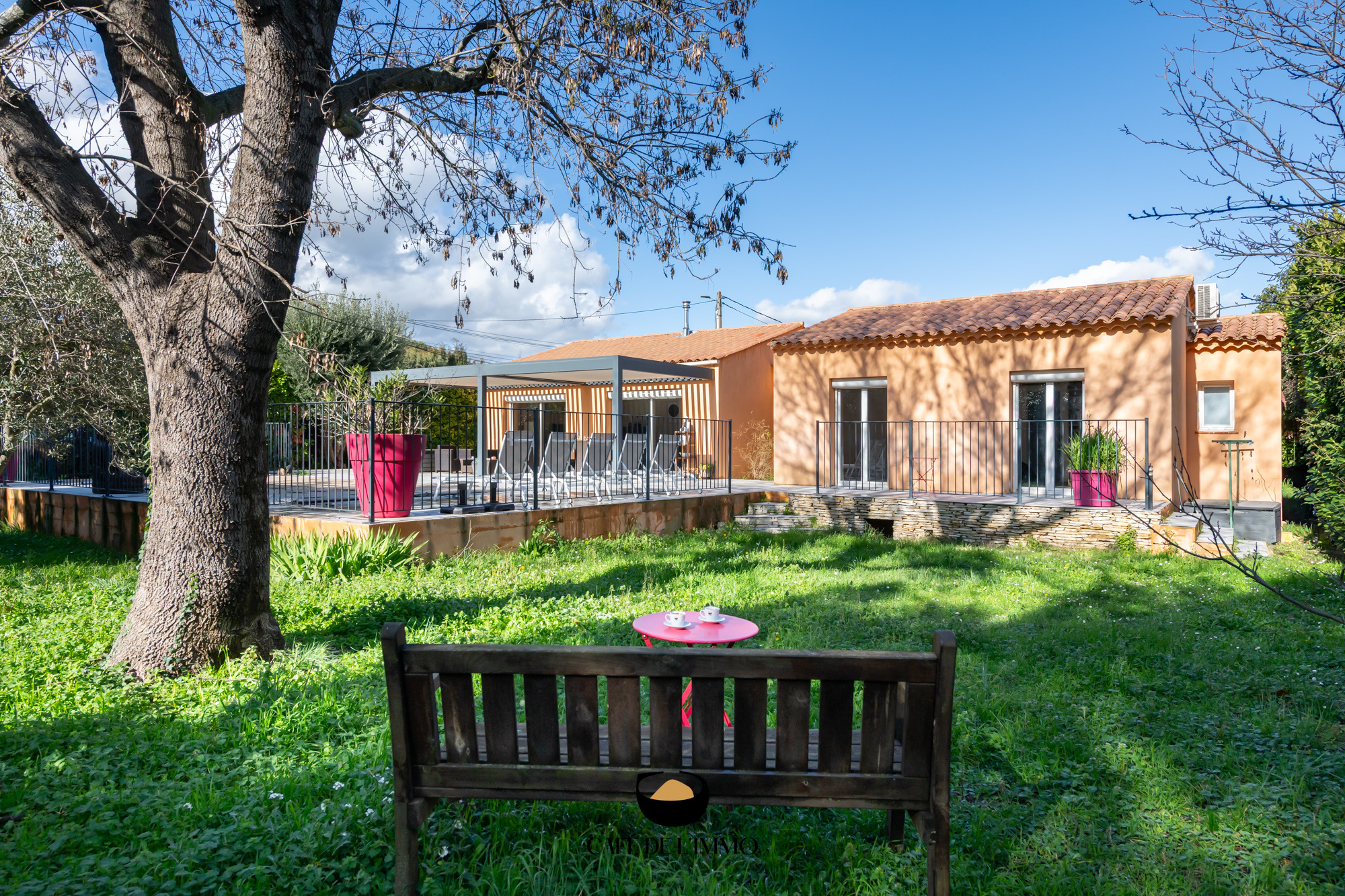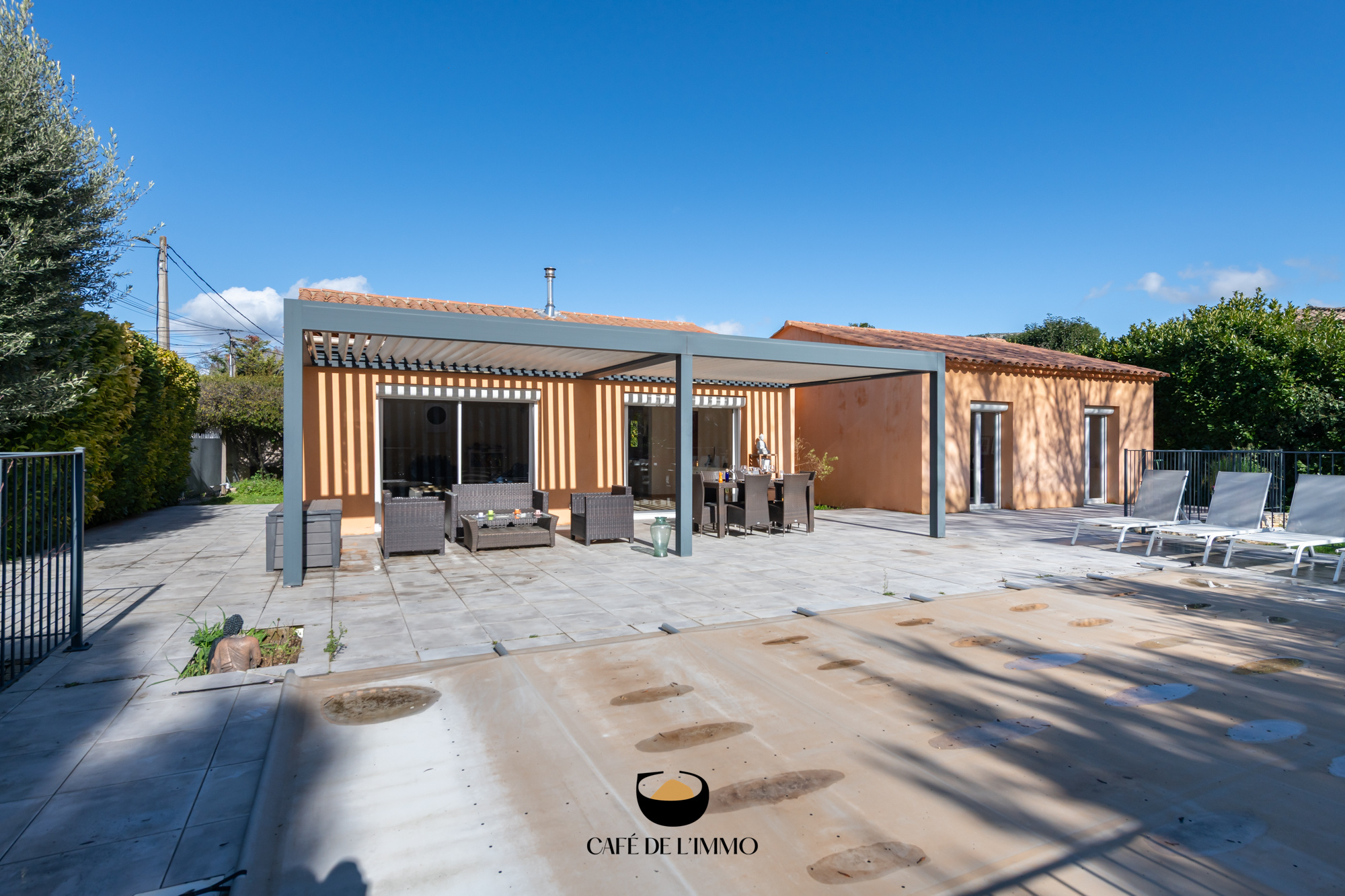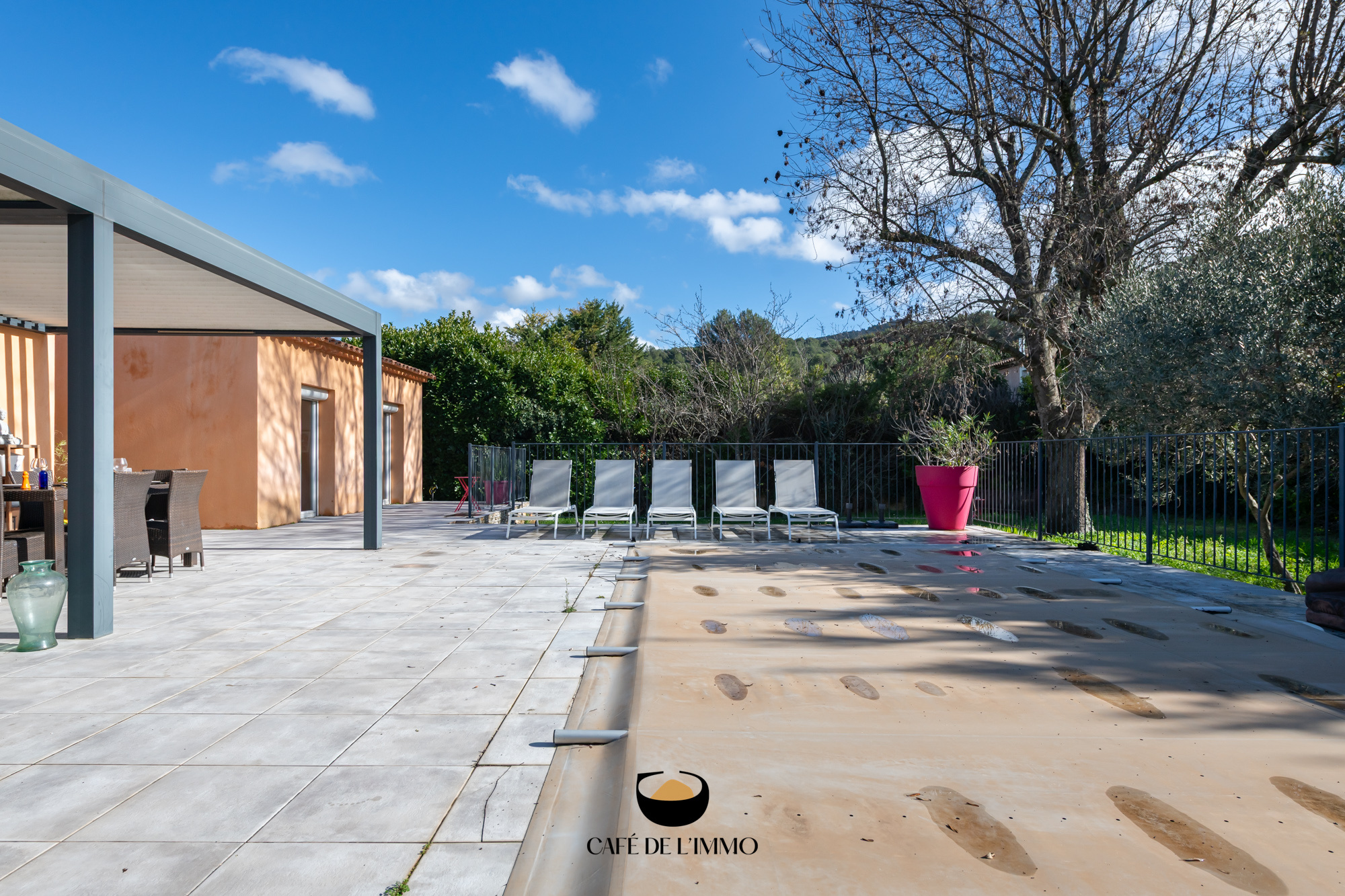 À l’extérieur, l’ambiance est celle d’un été qui dure : piscine, terrain de boules, terrasse ombragée, pergola bioclimatique et un jardin qui invite à ralentir. Un garage complète les prestations.