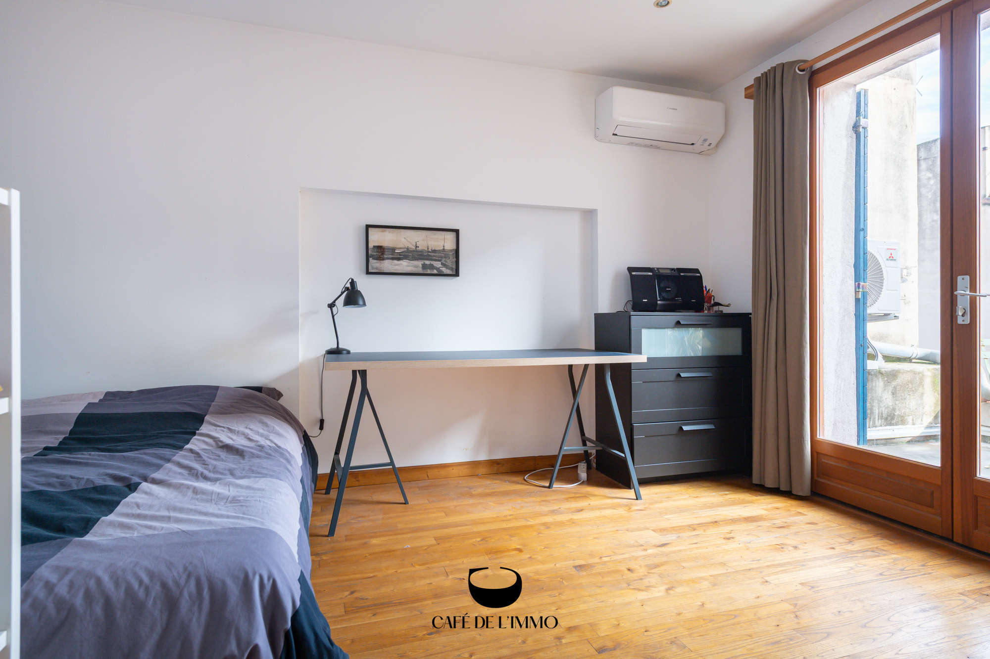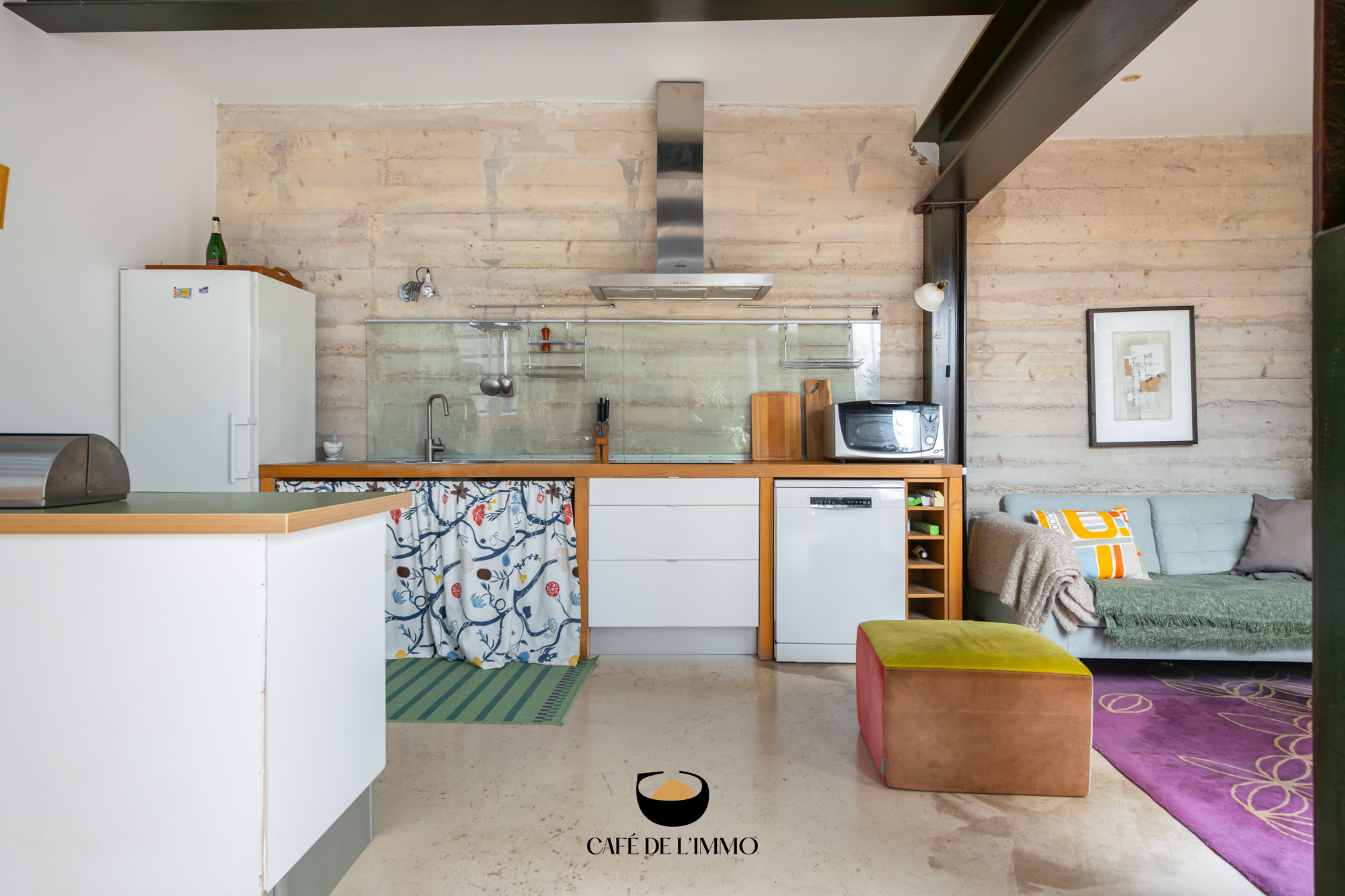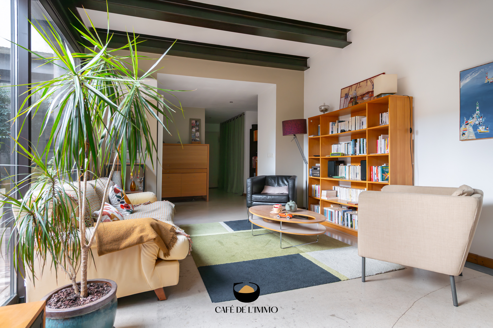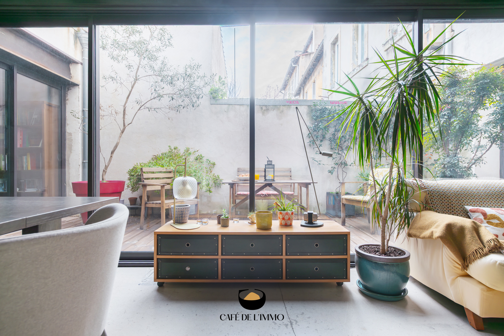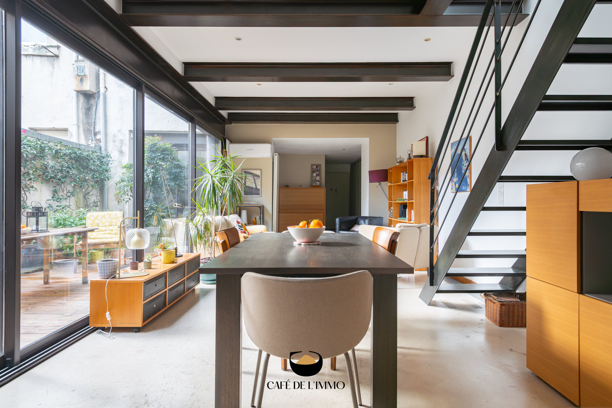 Entièrement rénové par des architectes, l’appartement (103 m2 loi carrez) joue la carte du caractère brut et chic : béton ciré, IPN apparentes, lignes franches et volumes maîtrisés. La pièce de vie s’ouvre largement grâce à une immense baie vitrée à galandage, effaçant la frontière entre l’intérieur et l’extérieur. Le regard file vers un patio intérieur, intime et silencieux… Un vrai effet dedans-dehors, rare en ville.