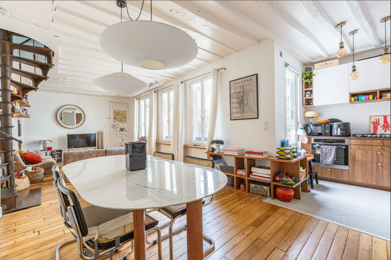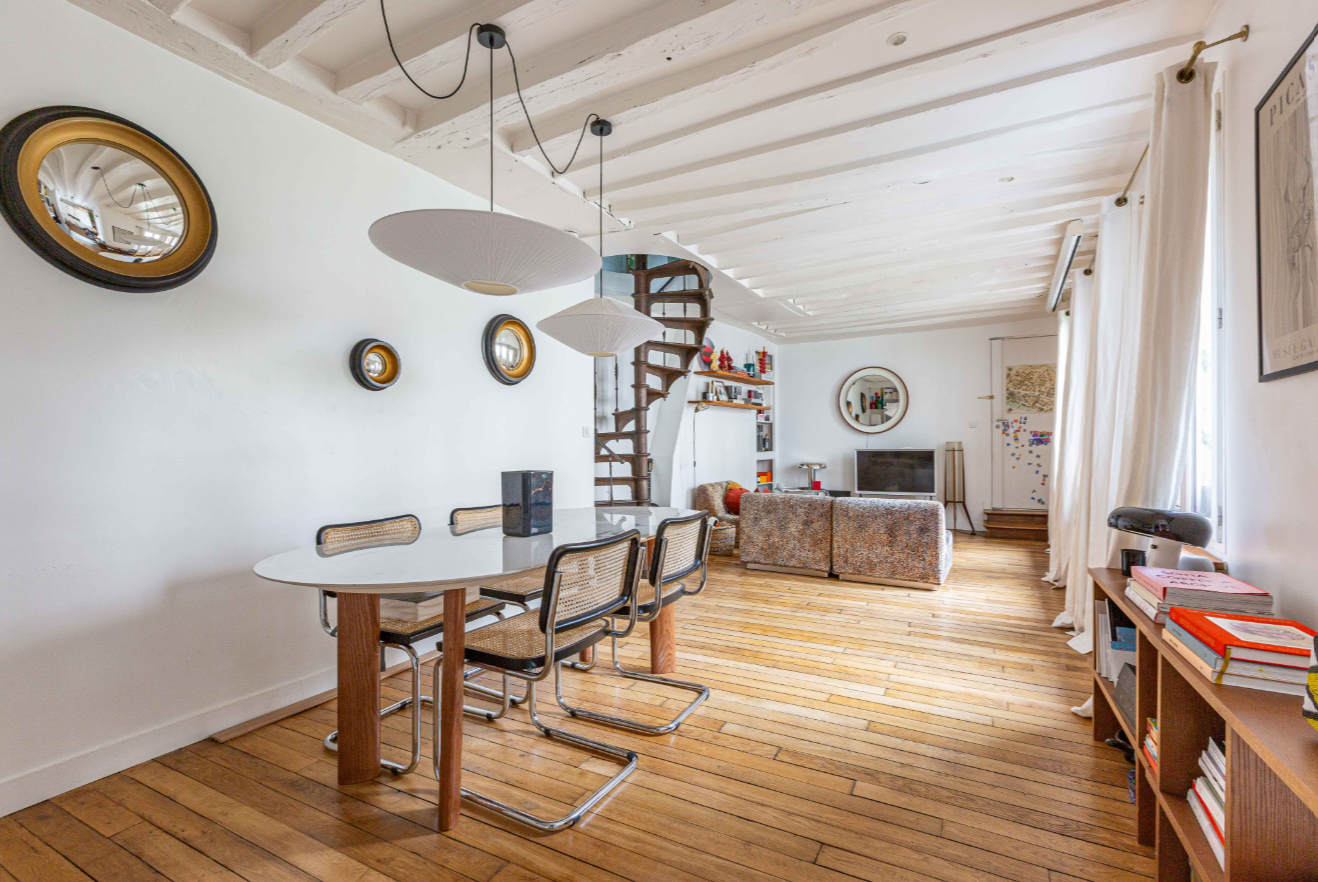 Baigné de lumière et au calme absolu, cet appartement séduira par son authenticité, ses poutres apparentes et ses prestations de qualité. Sa situation est idéale, à proximité immédiate du métro Saint-Paul et des commerces de la rue Saint-Antoine.