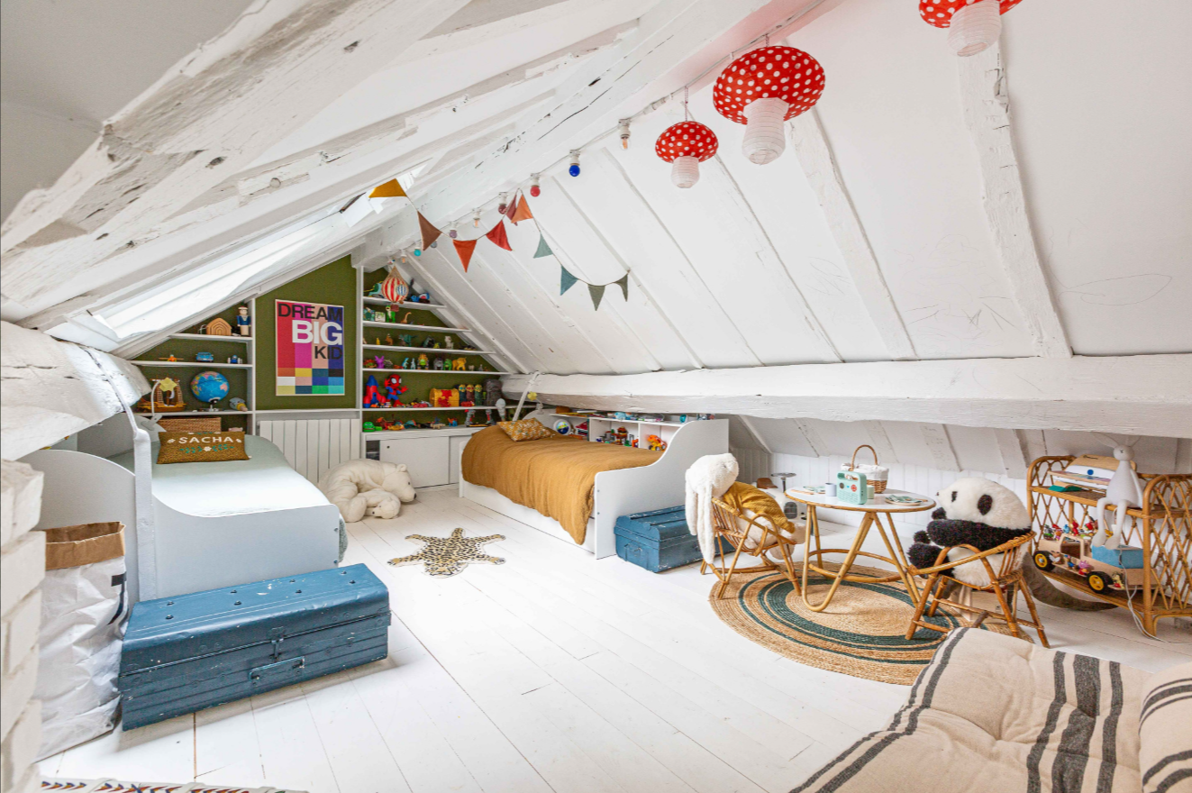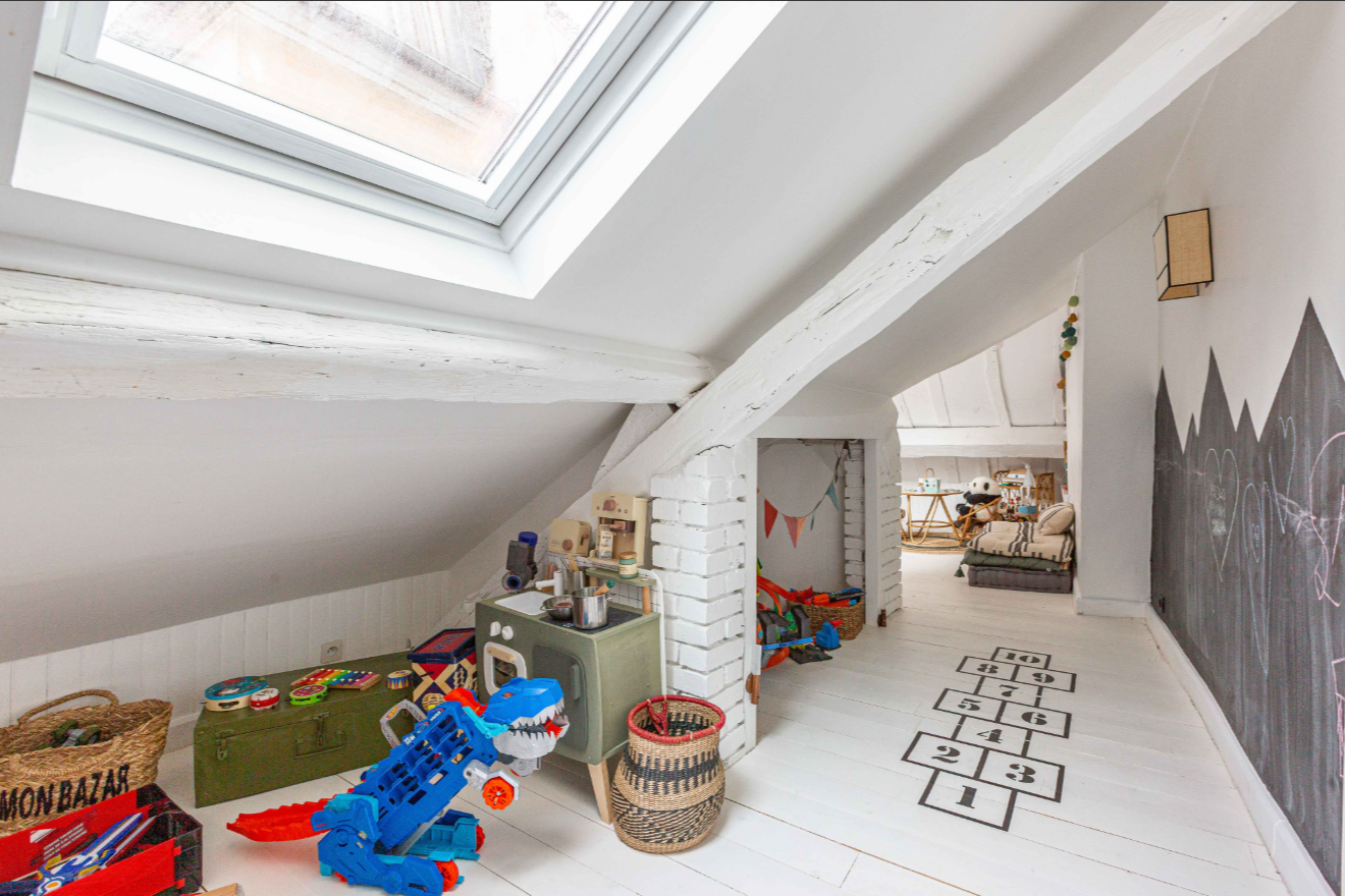 Au dernier étage, une seconde chambre dispose de deux lits enfants avec de nombreux rangements et des WC séparés. Les espaces sous mansardes ont été optimisés pour offrir de nombreux rangements. Une pièce supplémentaire sur le palier faisant office de buanderie, ainsi qu'une cave de 9 m2, complètent ce bien.