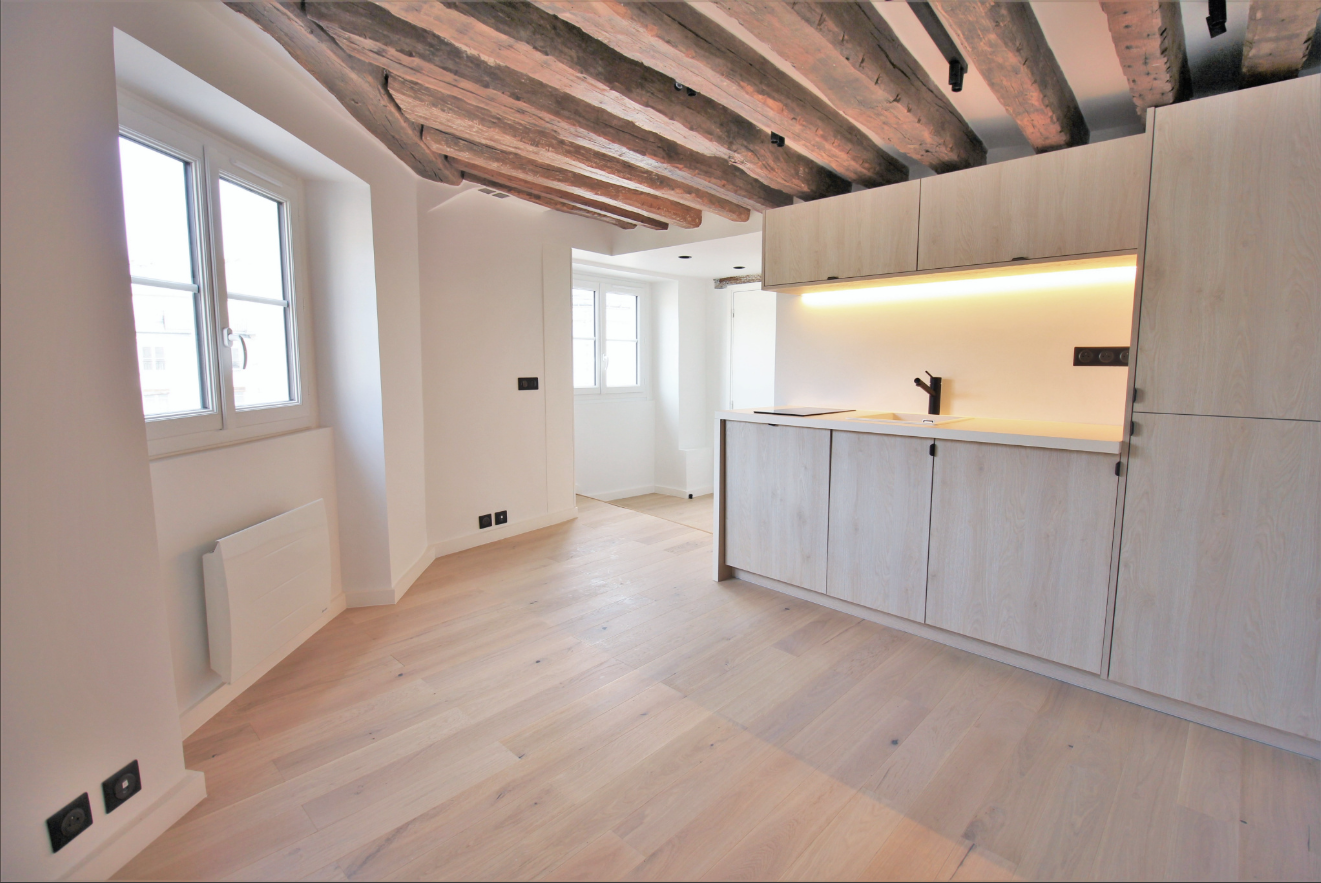Rives Sainte Catherine vous propose un studio de 18m2 qui a été entièrement refait à neuf, situé au 5ème étage d'une copropriété très bien entretenue. Il se compose d'une pièce de vie avec cuisine ouverte et équipée (lave-vaisselle, plaque de cuisson, hotte, réfrigérateur, four à micro-ondes et emplacement pour lave-linge), ainsi que d'une salle d'eau avec douche à l'italienne et WC. L'appartement bénéficie d'un emplacement privilégié à proximité immédiate de la Place du Marché Sainte-Catherine et de la Place des Vosges. Il est proche de tous commerces, des Meilleurs Ouvriers de France et du métro Saint-Paul. Ce bien est idéal pour un investissement locatif ou un pied-à-terre.